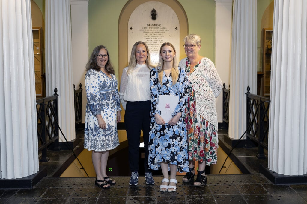 Lise Camilla Ruud (andre fra venstre) saman med Malin Eckhoff Årnes og lærarane hennar, Karen Marie Mikkelsen (t.v.) og Hilde Lærum frå Drammen vidaregåande skule. Årnes vann andreprisen i Holbergprisen i skolen i 2024.