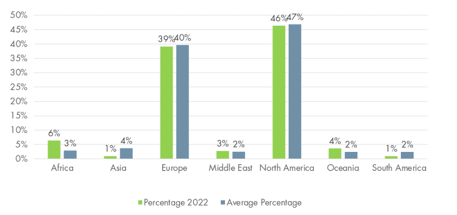 Akademiske miljø i Nord-Amerika og Europa dominerer både på nominator- og kandidatsida. Denne tendensen har vore stabil heilt sidan Holbergprisen blei oppretta i 2004. Tabellen under syner den geografiske fordelinga for kandidatar i 2022 samanlikna med gjennomsnittet for 2004–2022. Det er her viktig å notere seg at sorteringskriteriet i denne samanhengen er primær institusjonstilknyting / arbeidsland, ikkje fødeland eller statsborgarskap. I denne oversikta er Israel rekna som tilhøyrande Midt-Austen, og Russland reknast til Europa.