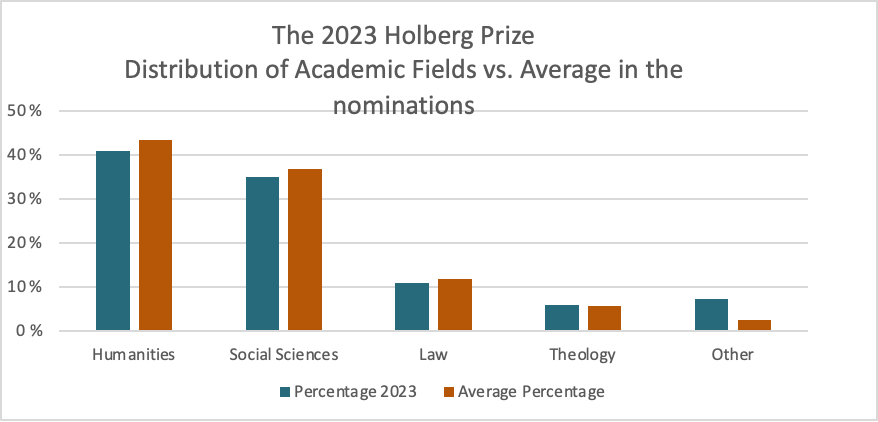 Jamført med tidlegare år ligg både ‘humanities’ og ‘social sciences’ (som store samlekategoriar) og ‘law’ og ‘theology’ ganske likt gjennomsnittet. Ei endring har skjedd i kategorien ‘other’ som inkluderer felt som ‘engineering’ og ukjende. Det bør merkast at denne statistikken faktisk syner til det totale talet på nominasjonar, og ikkje til godkjende kandidatar.