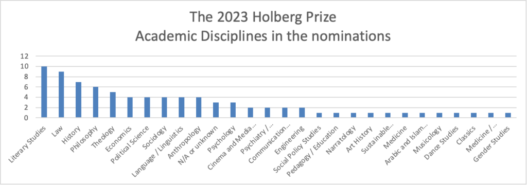Ei meir nyansert inndeling syner at ‘literary studies’ har flest nominasjonar, fulgt av ‘law’, ‘history’, ‘philosophy’, osv. Her synast også nominasjonar innanfor den breiare kategorien ‘other’ med ‘N/A’ or unknown’ og ‘engineering’.
