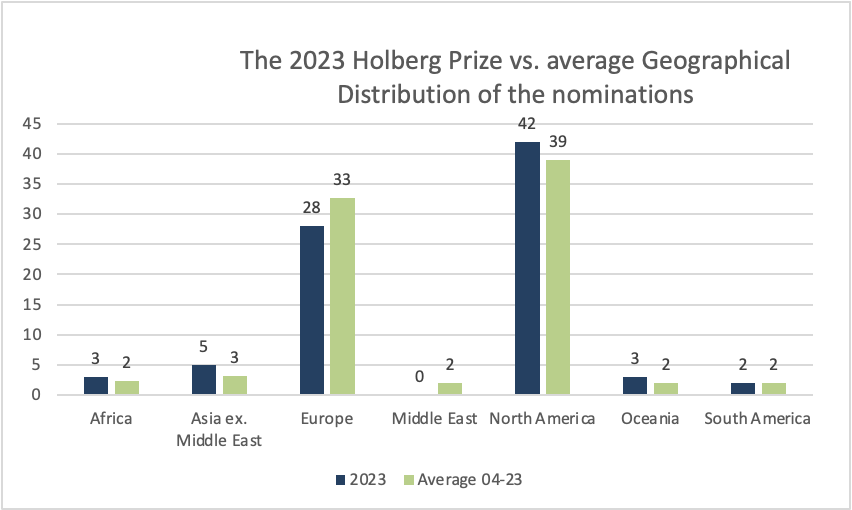 Akademiske miljø i Nord-Amerika og Europa dominerer både på nominator- og kandidatsida. Denne tendensen har vore stabil heilt sidan Holbergprisen blei oppretta i 2004. Som tabellen under syner er den geografiske fordelinga for kandidatar i 2023 på linje med gjennomsnittet for 2004–2023. Det er her viktig å notere seg at nasjonalitet i denne samanhengen er rekna etter primær institusjonstilknyting / arbeidsland, ikkje fødeland eller statsborgarskap. I denne oversikta er Israel rekna som tilhøyrande Midt-Austen, og Russland reknast til Europa.